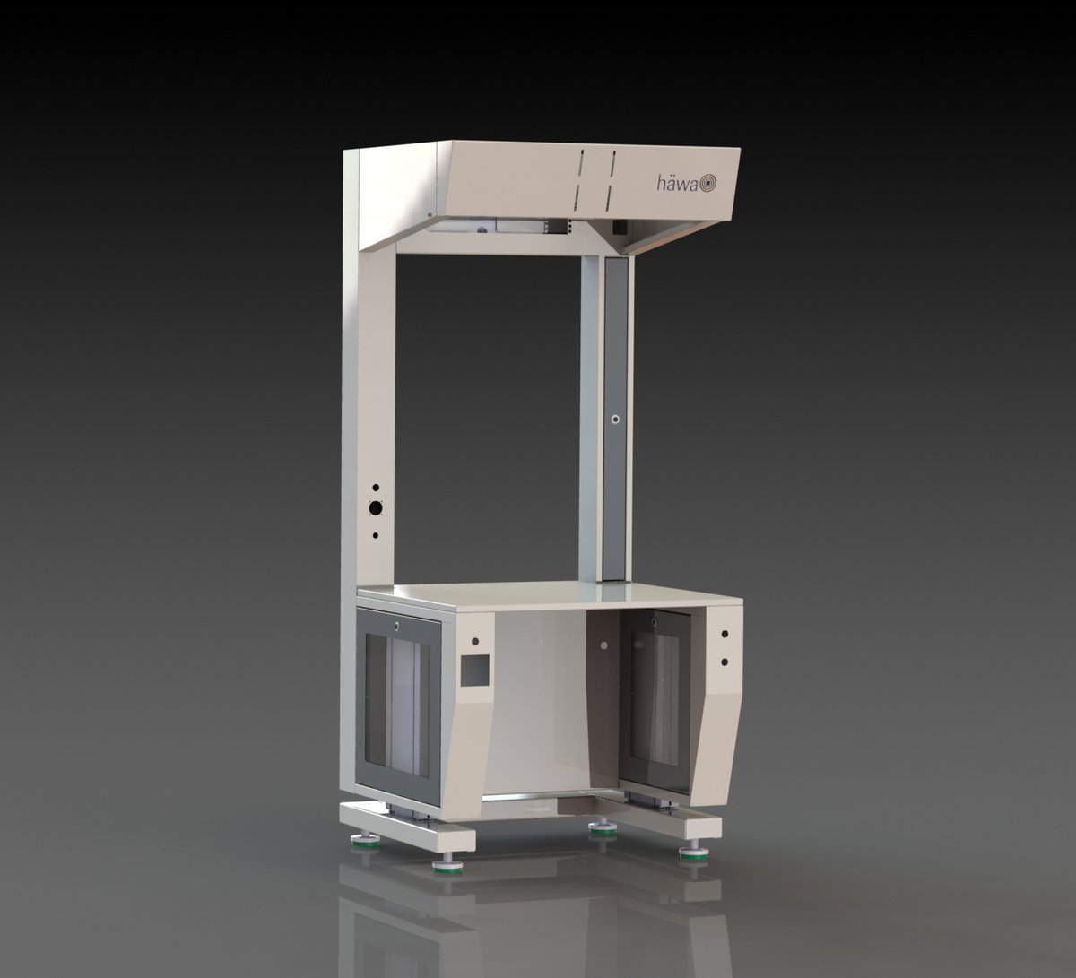 Der häwa-Handarbeitsplatz hat eine elektrische Höhenverstellung, mit der die Arbeitsfläche bequem auf- und abgefahren werden kann. Pneumatische und elektrische Anschlüsse lassen sich wie bei allen X-frame Maschinengestellen individuell integrieren, ebenso Monitore, 19’’-Einschübe oder Schiebeleisten für Akkuschrauber. Um die hohe Qualität von häwa auch nach außen sicht- und fühlbar zu machen, wird das Gestell in einem aufwendigen Verfahren mit robustem ESD-Pulver beschichtet.